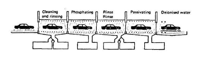 یک سیستم فسفاته کاری به روش غوطه وری بایستی شامل تعدادی مخزن، کنترل کننده درجه حرارت و سطح محلول، سیستم های خروج بخار، تجهیزات لازم برای جابجا کردن مواد و تجهیزات برای خشک کردن باشد در زیر یک نمونه فرآیند پوشش دهی به روش غوطه وری نشان داده شده است.